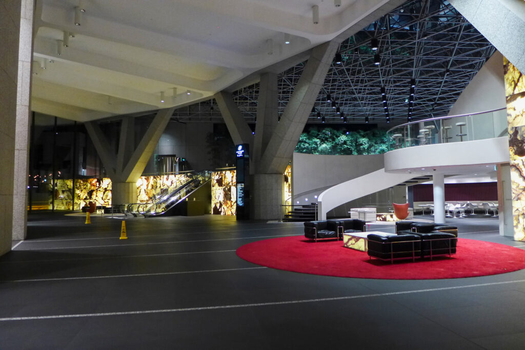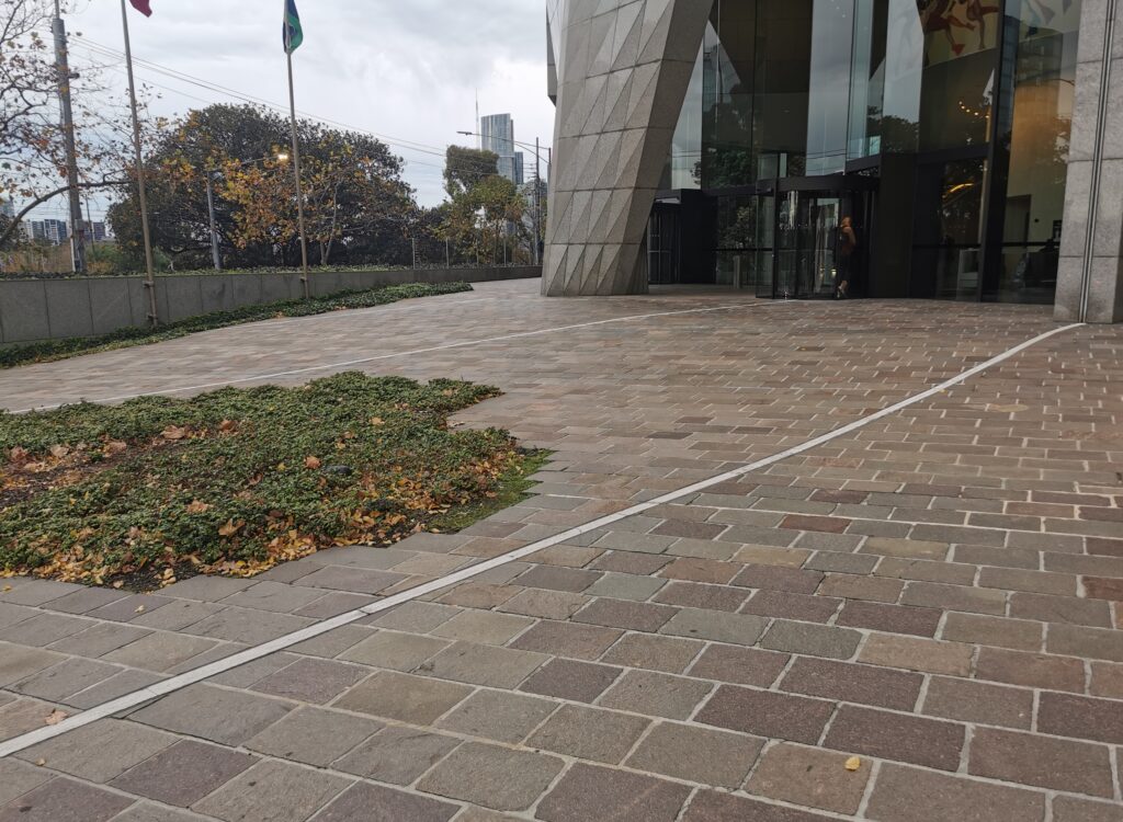 Mostly, the stripes are travertine. Travertine is often used as a wall cladding. When illuminated, the lightness of the travertine glows brightly, creating a perception of brightness far higher than if light was to be cast onto the floor. The white travertine stripes run out from the building to the streetscape and beyond. They guide the eye to the heart of the building.