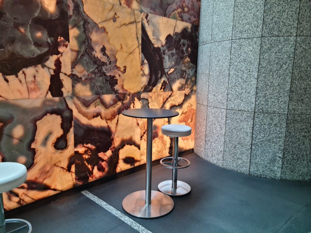 At Grosvenor Place in Sydney [originally designed by Harry Seidler in 1982], we were commissioned to design the renewal of large areas of the ground plane and create an internal lounge. The lobby features an internally illuminated Pakistan green onyx wall – designed not just as a visual feature, but with functional purposes. The onyx wall is located in the rear of the lobby away from street – the idea was to have a striking design element there, to draw attention. The rear of the lobby was always darker, and we needed something to generate brightness without the apparent use of artificial illumination.