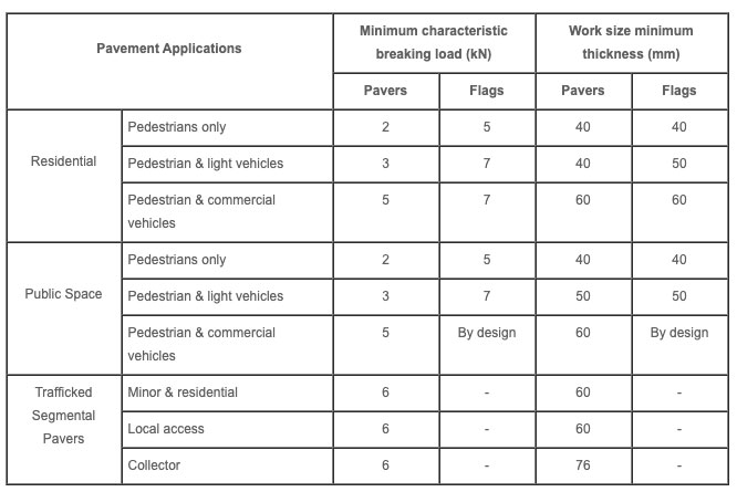 Table 2.8 of the standard summarised below, sets minimum breaking load and dimension requirements for paving units to be installed within various locations. The standard differentiates between ‘pavers’ and ‘flags’ with a ‘flag’ defined as a large format solid paver with a gross plan area greater than 0.08m2 (e.g. greater than 200mm x 400mm).
