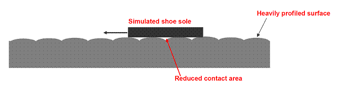 Testing by Stone Initiatives has found that although antiqued (i.e. flamed and wire brushed) stone finishes and similar finishes on ceramic tiles can appear to be quite ‘slip resistant’ some of these finishes produce a much lower BPN result than would be expected. The low test result is supported by the investigation of a range of wet slip / fall incidents involving tiles with textured finishes. These incidents predominantly involve pedestrians wearing hard rubber sole shoes walking on textured surfaces with rounded edges. In this situation the hard and flat rubber has a tendency to skid over the top of the surface as shown in the sketch below.