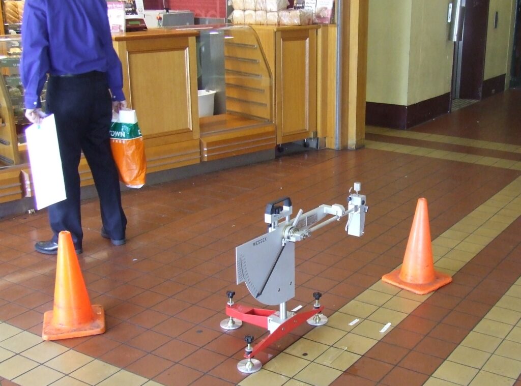 – Is the surface unlikely to become wet? Some locations such as upper level lift lobbies or corridors are unlikely to become wet and therefore evaluation of the dry slip resistance using the Floor Friction Tester may be all that is required. The proposed location should be surveyed for occasional ‘water hazards’ such as wet umbrellas and beverage spills and the risk assessed accordingly.