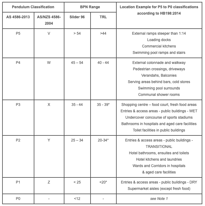 The rubber slider is firstly conditioned on Grade P400 abrasive paper then further conditioned on 3 micron lapping film and is then set up to come in contact with the test surface over a specified distance. Testing is carried out at five sites with a minimum of five swings at each location or until a relatively consistent reading is achieved. The mean BPN value is calculated and converted into a classification ranging from P5 to P0 for new pedestrian surfaces. Up until mid 2013 the classification ratings ranged from V to Z but this has now changed to the new P ratings within the most recent version of the standard. A significant change between the two standards is the fact the slider is conditioned with the use of lapping film which gives the slider a smoother finish prior to testing. This ‘polishing’ provides more sensitivity to the lower test results. Also the new P version adds in an extra classification than the V to Z version had, as shown in the table below. A P5 classification is considered to represent a very low contribution of the surface to the risk of slipping when wet while a P0 classification represents a very high risk.
