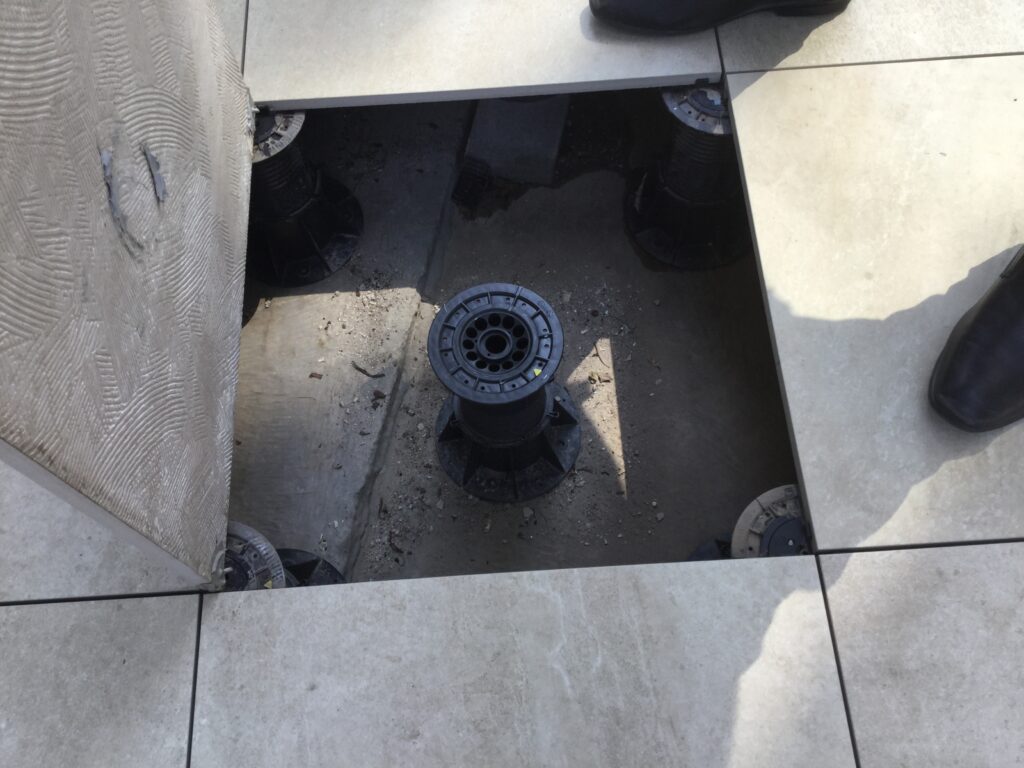 Example of a pedestal support system, which raises the tile off the existing surface and creates a void between the paving and the membrane.